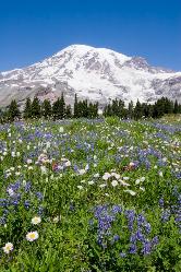 "…above the forests there is a zone of the loveliest flowers, fifty miles in circuit and nearly two miles wide, so closely planted and luxuriant that it seems as if Nature, glad to make an open space between woods so dense and ice so deep, were economizing the precious ground, and trying to see how many of her darlings she can get together in one mountain wreath, —daisies, anemones, geraniums, columbines, erythroniums, larkspurs, etc., among which we wade knee-deep and waist-deep, the bright corollas in myriads touching petal to petal. " That is quite a statement towards the historical beauty of Mount Rainier.